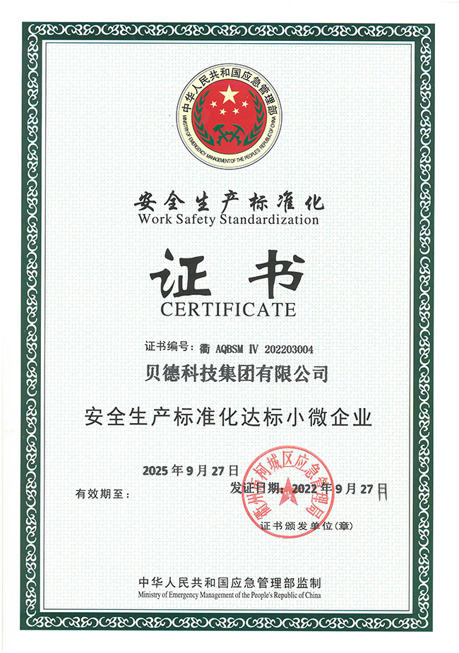 安全工作沒有最好,只有更好,貝德科技集團將以取得“安全生產標準化達標小微企業”證書為契機,不斷夯實安全生產管理,規范安全管理各項工作,提升安全生產水平,為公司長久發展保駕護航。