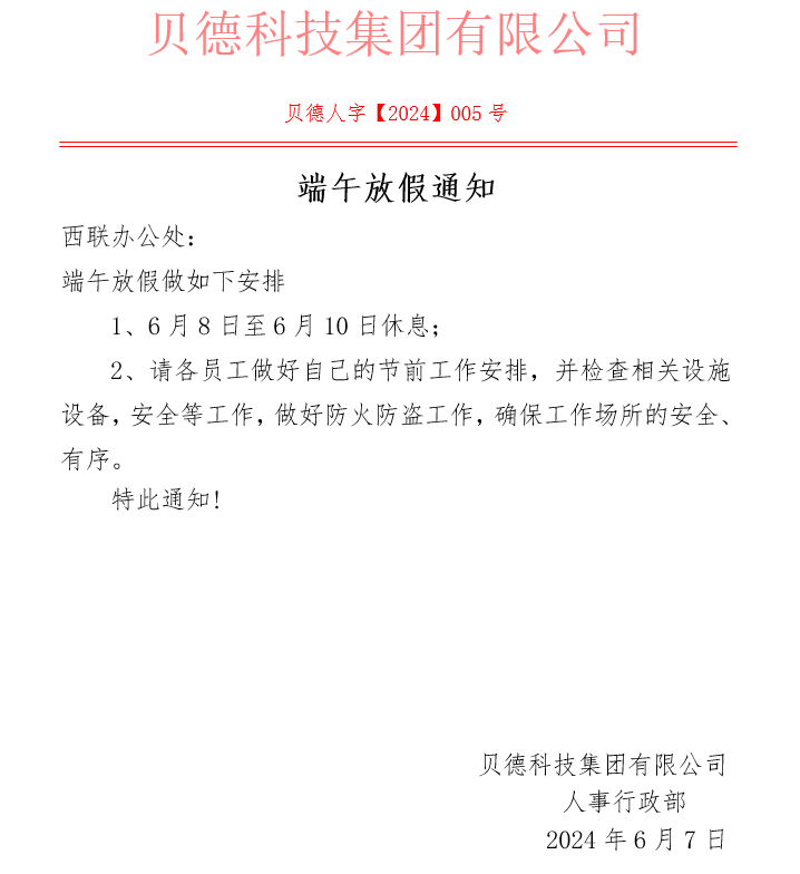 各個部門員工要做好自己的節前工作安排,切實做好公司防火、防盜、安全、保衛等工作,確保工作場所的安全、有序。預祝大家端午節安康!