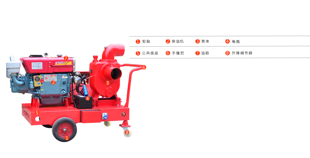 2.手推式強自吸移動泵車主要由真空輔助裝置、柴油機動力包、柴油機專用油箱、泵傳動系統、設備底座、自吸泵總成、防雨設施、起動裝置、起動電源裝置、進水管總成、出水管總成、二輪移動拖車系統、快速起吊裝置等組成。